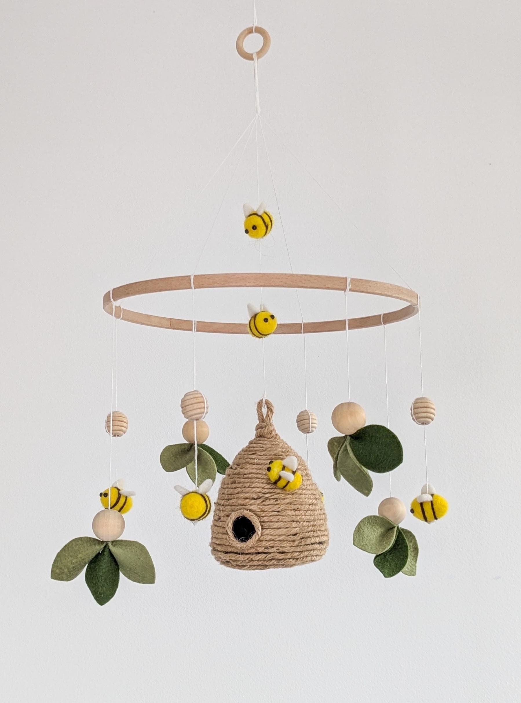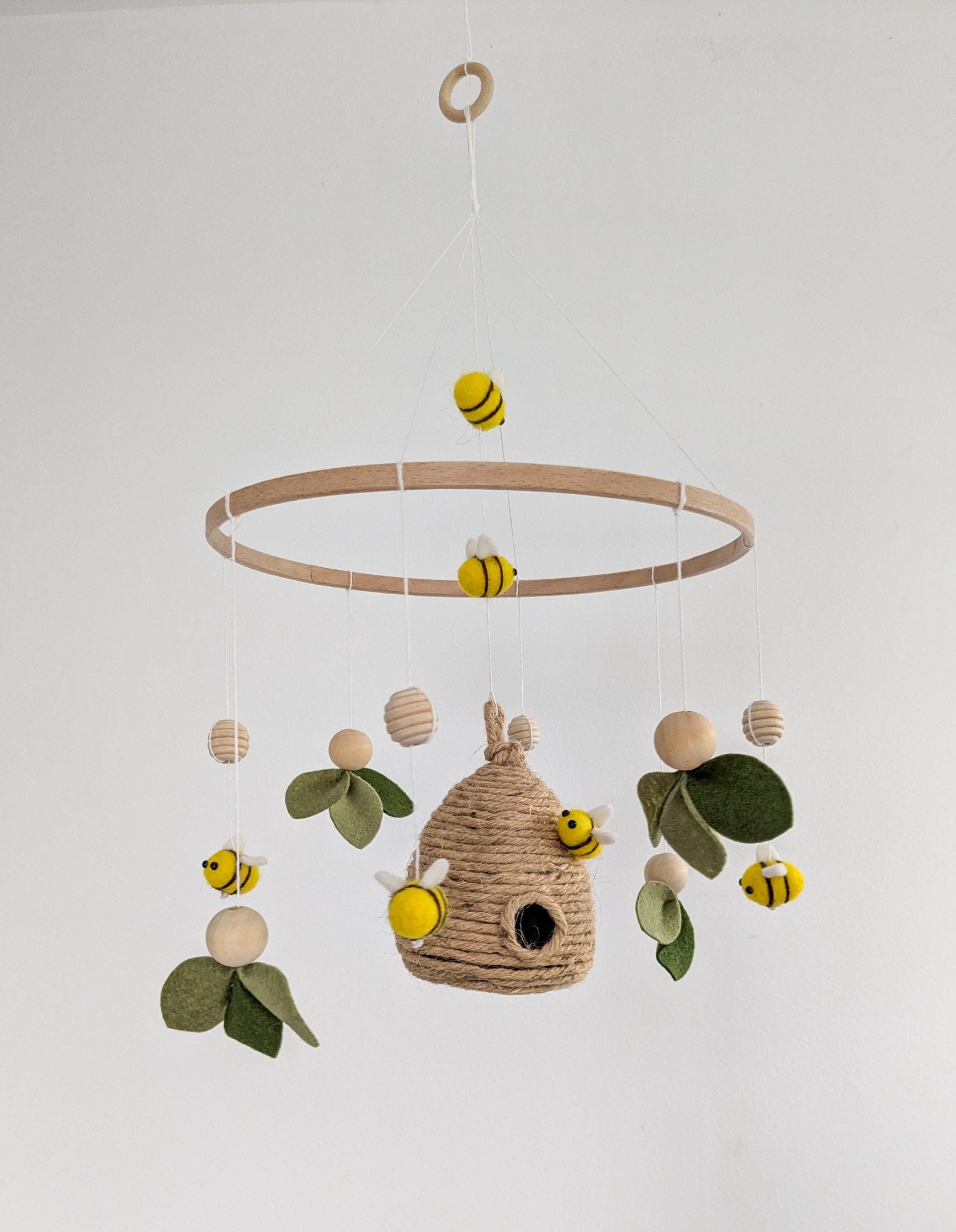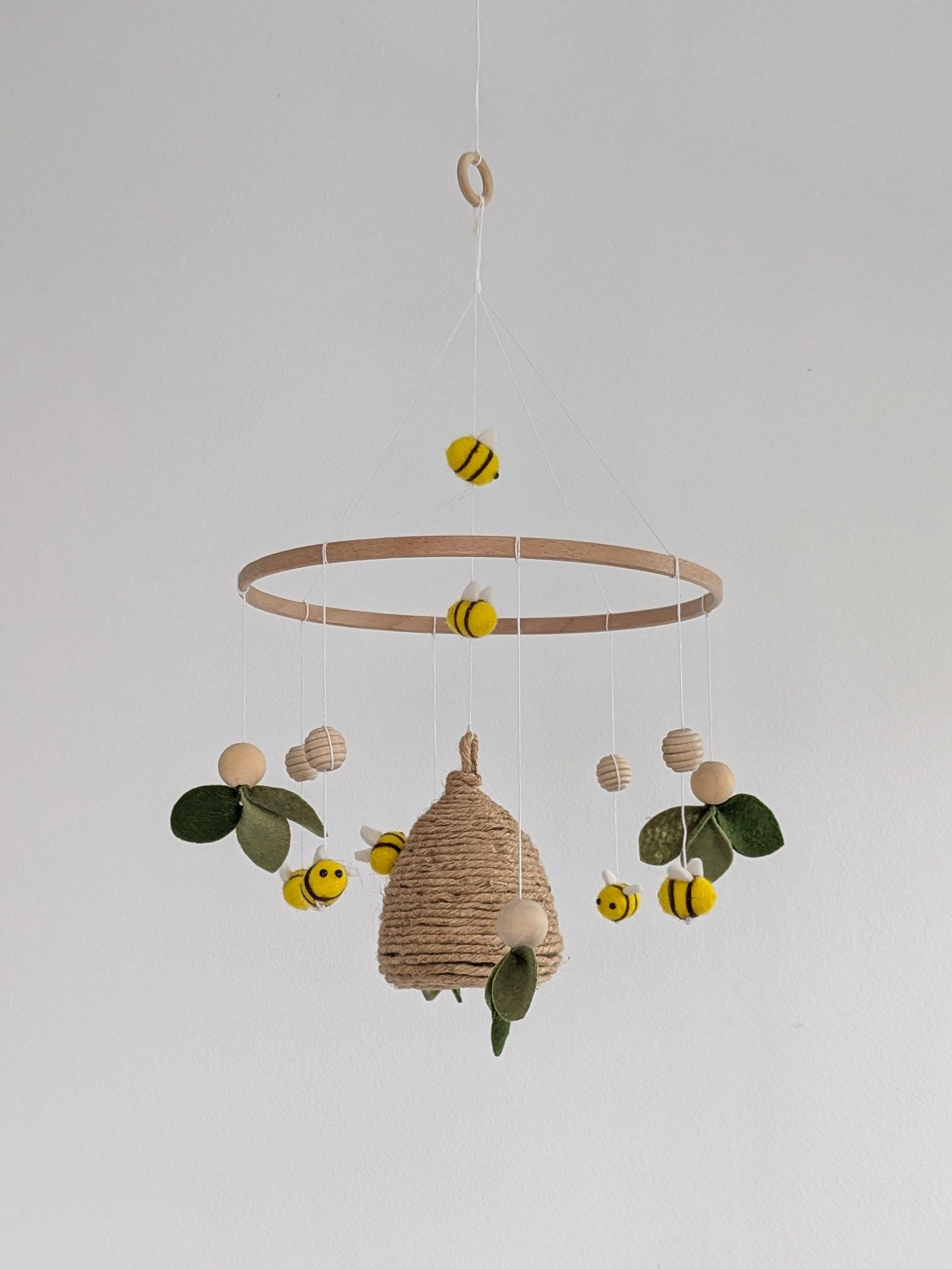 Ajoutez une touche de douceur naturelle à la chambre de votre bébé avec ce magnifique mobile inspiré des abeilles et de leur ruche. Conçu à partir de matériaux naturels et durables, il apportera une ambiance chaleureuse et poétique.